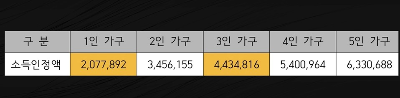 중위소득 100% 이하로 1인 가구 기준으로 약 207만원 , 3인가구 기준으로는 약 443만원 정도 됩니다.